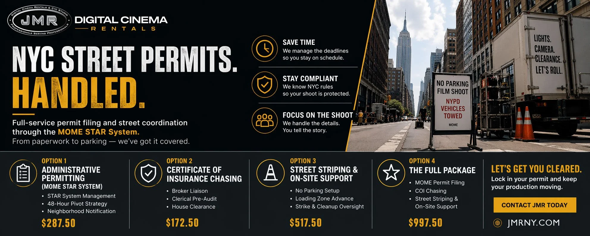 JMR Digital Cinema Rentals now offers full-service permit coordination through the MOME STAR System — built specifically for production companies that need things done right, and done fast.